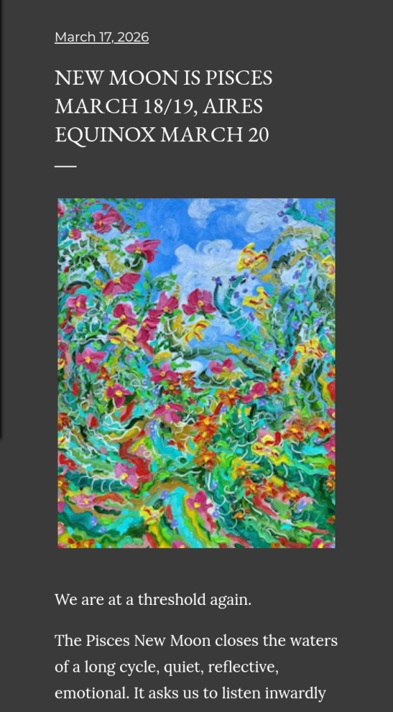The Pisces New Moon and Aries Equinox mark a quiet threshold. The closing of one cycle and the beginning of another as the year turns toward new fire and life. I wrote a brief note on this seasonal change on The Polymath site. It can be read here.