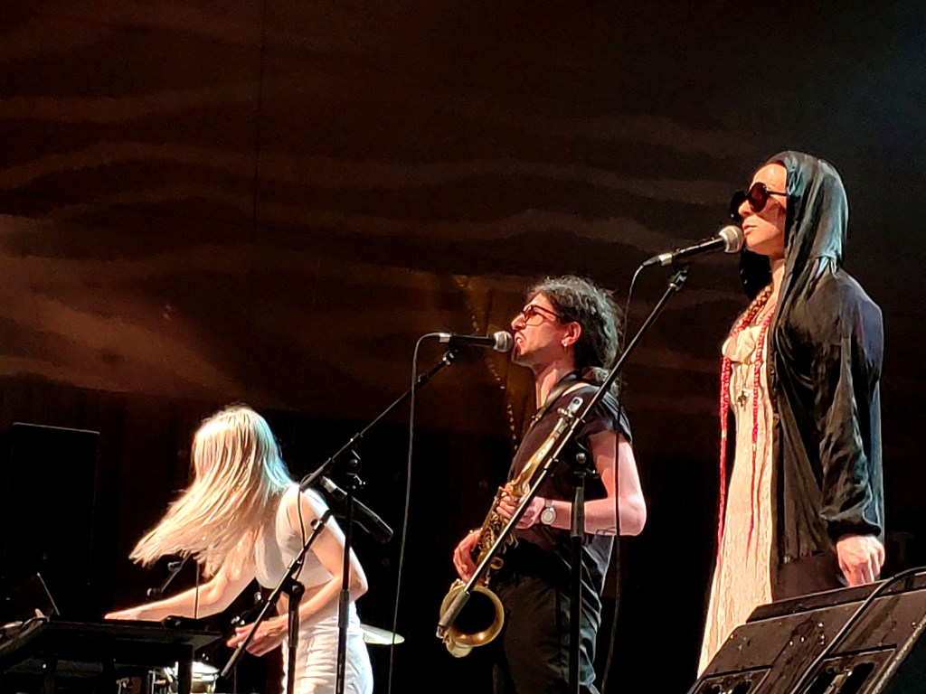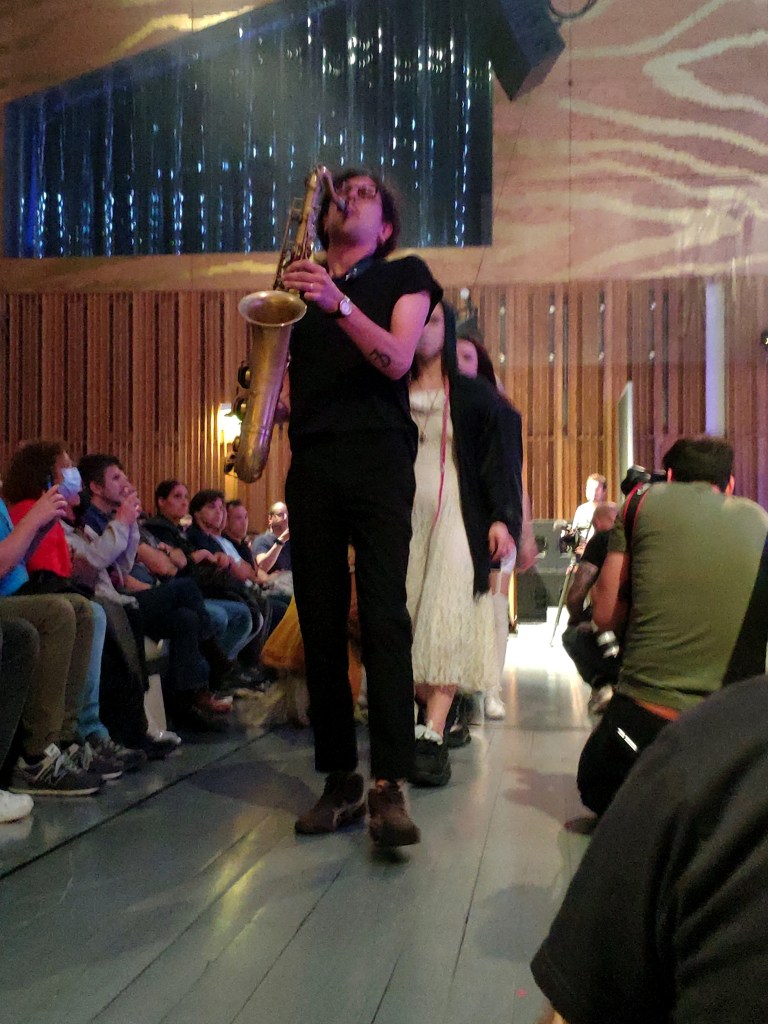 Diana Burkot in her beautiful white figure, accompanied by a small drum kit and minimal electronics pre-cooked on very low heat started the show and led the manifesto in a raw and rhythmic tone that so much characterizes the band. Next to the new member Anton Ponomarev lends his voice and saxophone to the feminist collective and adds a jazzy tone that so well makes up the music scene; at times there is screaming, sometimes it rocks, inviting to the endless struggle for freedom and democracy. Finally, Olga Borisova, the editor of the book, and Maria ‘Masha’ Alekhina, arrested several times and founding leader of the band, explode in an assertive register and discuss the lyrics of the manifesto that reflects their strong displeasure with Putinβs regime and their unconditional support to Ukraine, in this case with a direct contribution to the construction of a children’s hospital in Kiev.