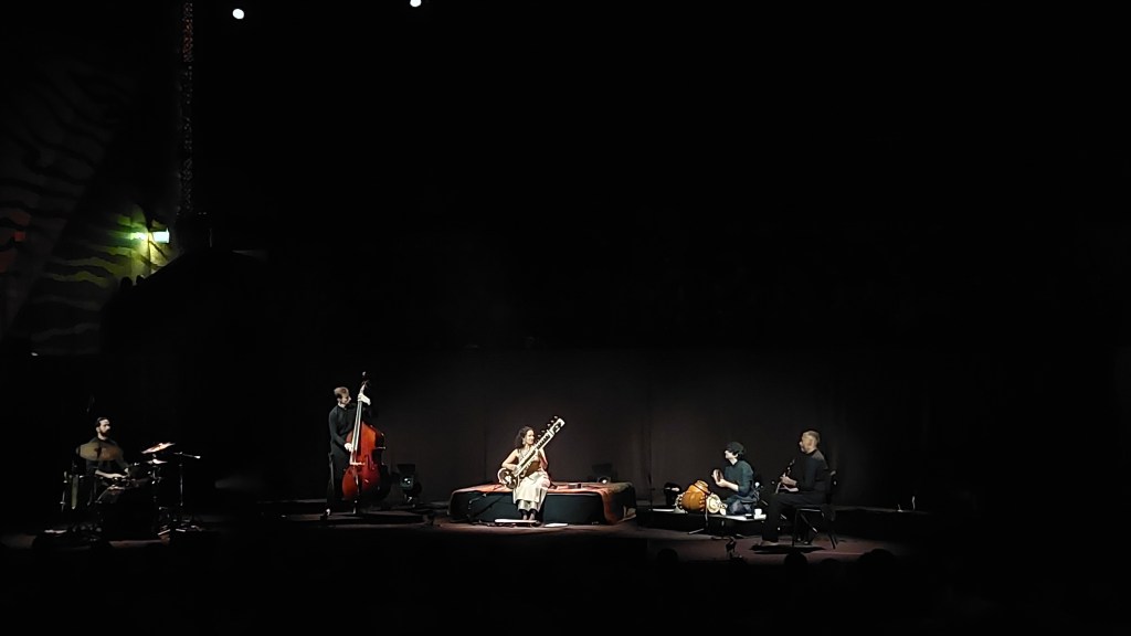 Casa da Música filled on a Wednesday night to listen to British sitar player Anoushka Shankar (Ravi Shankar’s daughter).Anoushka steps on stage alone, under a single light, and plays Offering, like a gift to those in attendance. Meanwhile the backs comes in Sarathy Korwar (drums), Pirashanna Thevarajah (percussion), Tom Farmer (double bass), Arun Ghosh (clarinet).