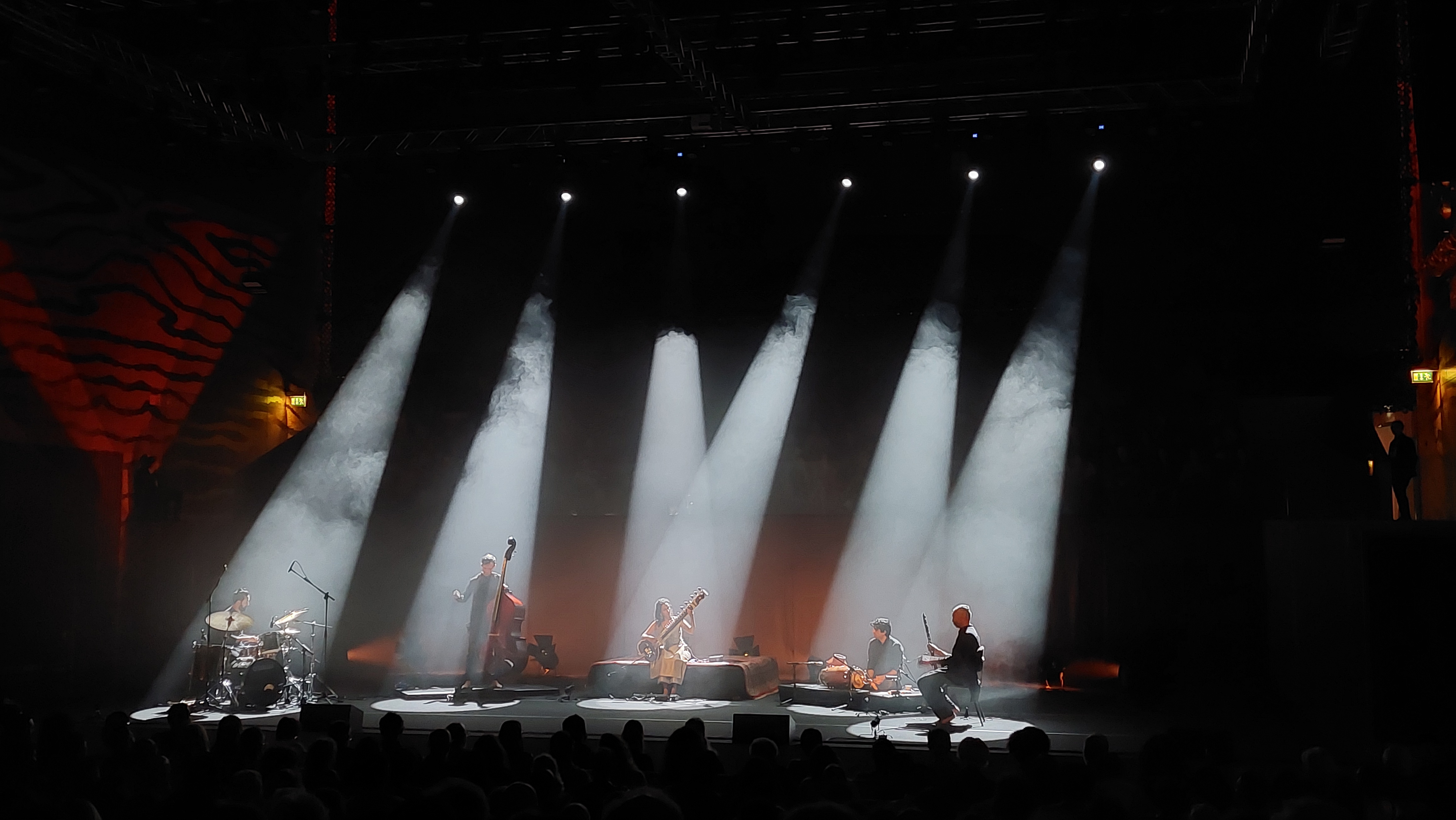 Casa da Música filled on a Wednesday night to listen to British sitar player Anoushka Shankar (Ravi Shankar’s daughter).Anoushka steps on stage alone, under a single light, and plays Offering, like a gift to those in attendance. Meanwhile the backs comes in Sarathy Korwar (drums), Pirashanna Thevarajah (percussion), Tom Farmer (double bass), Arun Ghosh (clarinet).