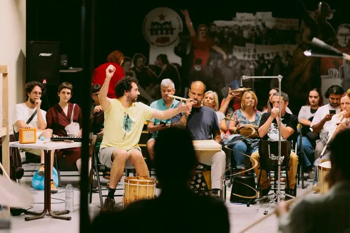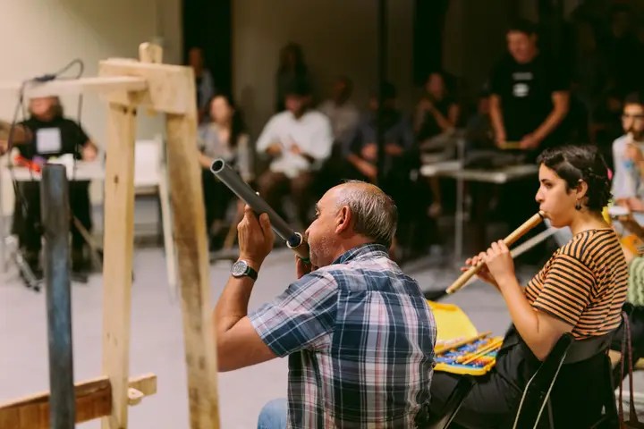 Being part of the group has been a very interesting experience. I elected the electric guitar as my main instrument, in itself a challenge. I’m far more familiar with an electric bass than with an electric guitar. Most of my other instruments are as peculiar and unique as Grupo Operário do Ruído: a couple of plastic beads necklaces, a children’s melodica, mismatched drum sticks, empty spices bottles, and more, and our claribones, what I call our odd purpose build mix of trombone and clarinet.