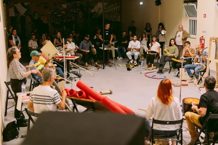 Many instruments we use were build on previous years of the existence of Grupo Operário do Ruído, some like my guitar, the traditional drums, the tambourine are convencional. My use of the electric guitar is anything but convencional. We’re often asked what we do, what we play. We’re still working on the musical piece directed by António Serginho and Carlos Guerreiro, to which we all contribute.